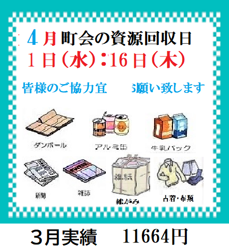 ◈お知らせ・お願い◈(画像クリック・タップ)【4月町会資源回収日】【町会資源回収場所】【粗大ごみ】【資源回収お願い】【車いす貸出】