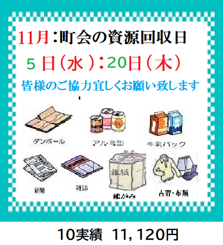 ◈お知らせ・お願い◈(画像クリック・タップ)【11月町会資源回収日】【町会資源回収場所】【粗大ごみ】【資源回収お願い】【車いす貸出】