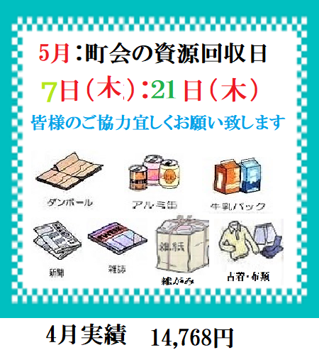◈お知らせ・お願い◈(画像クリック・タップ)【5月町会資源回収日】【町会資源回収場所】【粗大ごみ】【資源回収お願い】【車いす貸出】